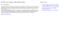 The Role of Leverage in STIR's Risk Procedure. Leverage and risk are different-but frequently conflated-concepts. Risk is concerned with the liklihood of the value of a balance sheet's assets declining by a certain amount. Leverage, on the other hand, measures the decline of the value of an equity stake given a decline in the value of assets. Read Full Article (pdf). Robie Uniacke Letter to Mervyn King, Bank of England Governor, 2004 (pdf). Investment Philosophy and Strategy (pdf).