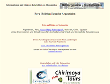 Informationen und Links zu Reisebilder aus Südamerika. Peru Bolivien Ecuador Argentinien. Fotos und Bilder aus Südamerika. Argentinien, Peru,. Boliv ien, Chile, Equador. Einige Impressionen und Webadressen für den Südamerika Urlaub und die nächste Reiseplannung. Buenos Aires fotografische individuelle Reise Annäherungen. An die Hauptstadt Argentiniens. Reise Fotos Buenos Aires. Auf dem Inka Trail auf dem Weg zur einst vergessenen Inka Stadt. Veranstalter und Info Reiseseiten. Von individuellen Peru Reisen.