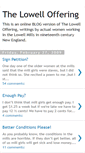This is an online BLOG version of The Lowell Offering, writings by actual women working in the Lowell Mills in nineteenth century New England. Friday, February 27, 2009. Let’s meet and discuss what we should do about this. Anyone interested, meet in the old town hall on 43. Street on Sunday, December 5. Come at 7:30pm. Thank you! December 11, 2012 at 10:25 AM. YEAZ BETTER CONDITIONS :-D. November 22, 2013 at 9:35 AM. I couldnt deal with breathing in dust for 11 hours a day. November 22, 2013 at 9:38 AM.